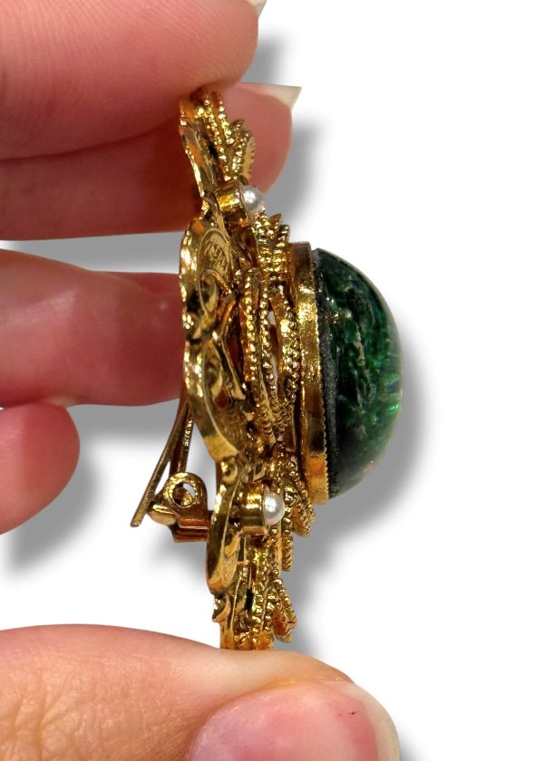 Women's clip-on earrings in antiqued gold-tone metal with decorative pearls and Murano glass, handcrafted by master glassmakers. Elegant, refined, made in Italy. One-of-a-kind, handcrafted piece. By Ave Caprice.