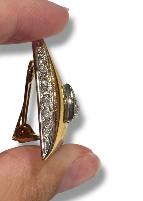 Gold-tone metal triangular clip-on earrings with sparkling crystals. A statement piece from the 1980s with a modern twist. Made in Italy, one-of-a-kind. By Ave Caprice.
