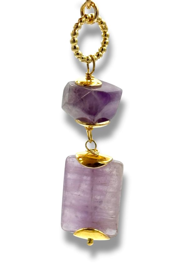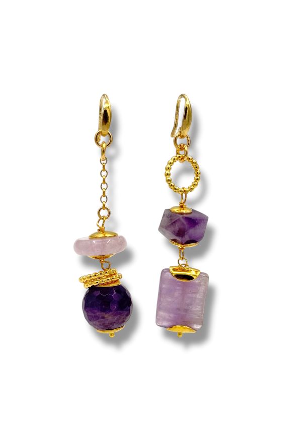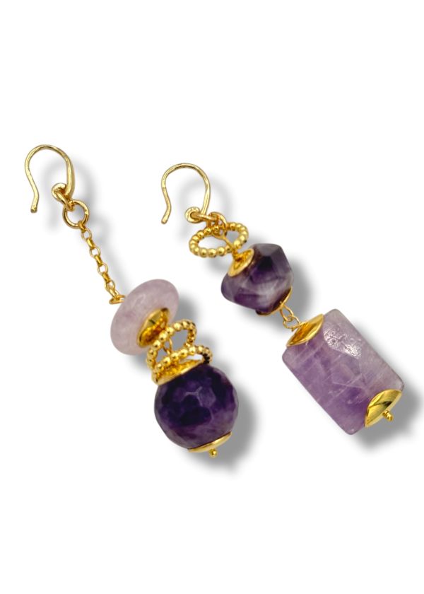 Handmade dangling earrings in gold-plated silver, crafted with care and attention to detail. The design features a harmonious and asymmetrical composition, playing on the balance between shapes, textures, and shades of purple. Amethyst is the true star: two varieties of this fascinating natural stone alternate in different color intensities and cuts—one faceted version that is more intense and brilliant, and one lighter, smooth, and delicate.