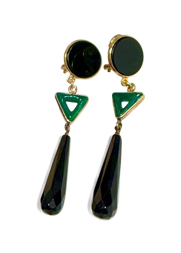 At the center, a delicate open triangle in green agate, brilliant and perfectly faceted, introduces a play of modern geometries that gives personality to the design. The composition is completed by an elongated faceted onyx drop, which creates movement and captures the light with every gesture, giving the earrings a dramatic yet harmonious presence.