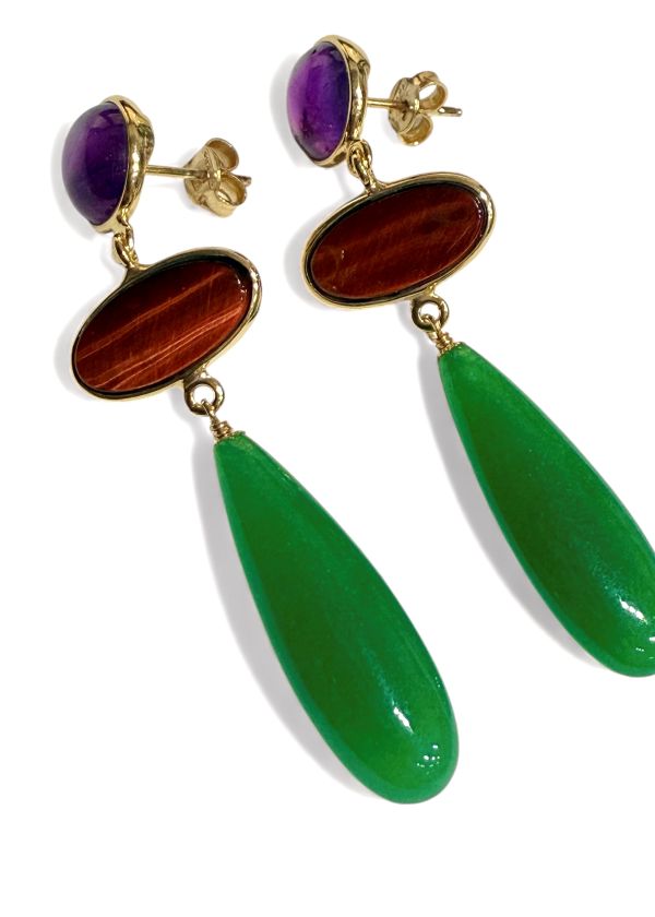In the central part we find the natural scapolite, a less common stone but appreciated for its warm veins and for the color that ranges between copper and golden brown. Its oval and slightly convex shape adds balance and harmony to the earring structure, creating an elegant contrast between the purple of the amethyst and the intense green of the final pendant.