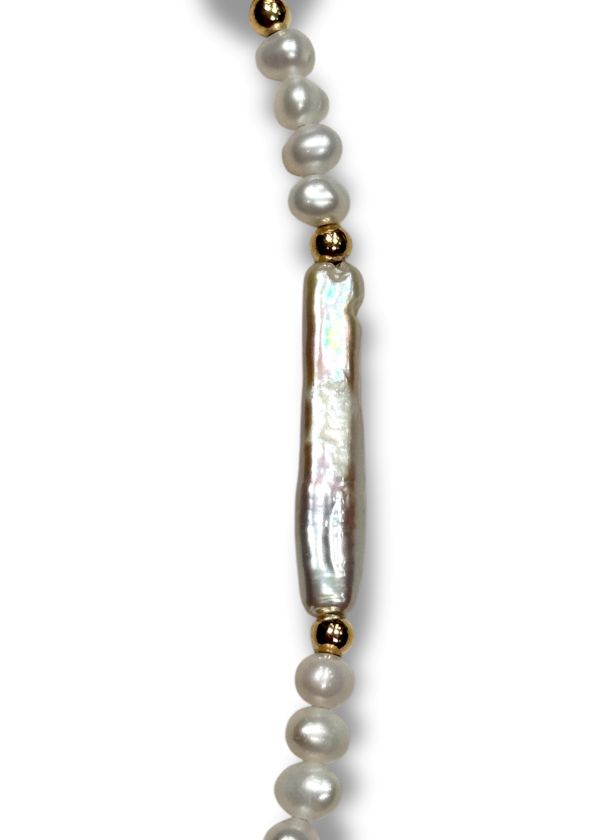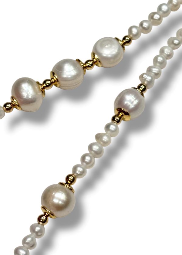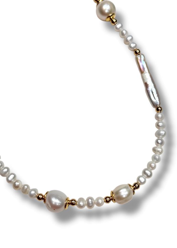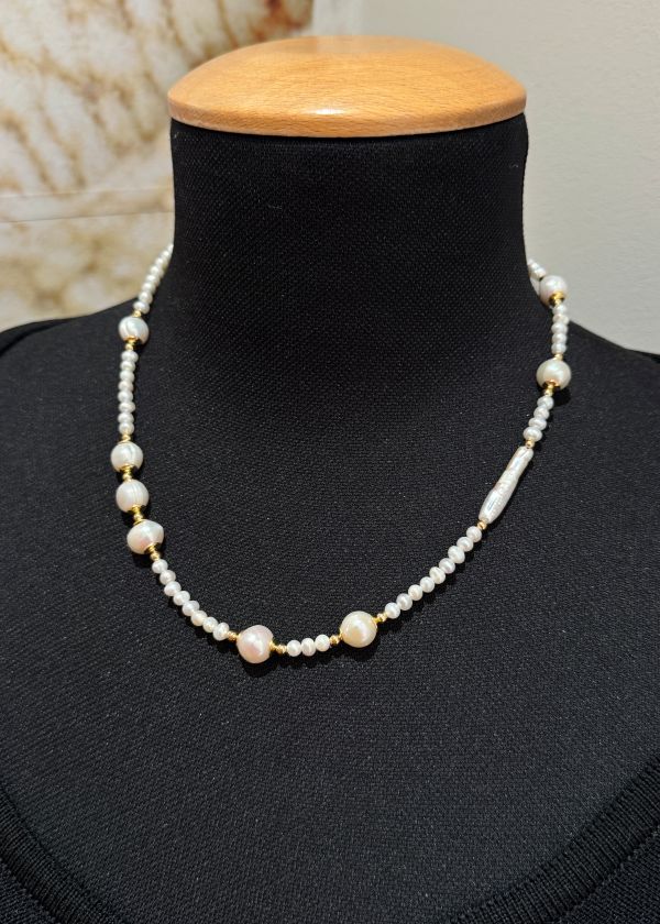 L’eleganza delle perle rotonde si intreccia con la particolarità delle perle barocche e allungate, creando un equilibrio unico e raffinato. Realizzato interamente a mano in Italia, questo gioiello è un pezzo unico, leggero ma di grande impatto visivo.