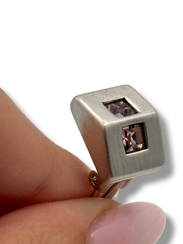 Un design minimal ma carico di carattere: questi orecchini a clip in metallo satinato colpiscono per la loro forma geometrica decisa e per l’equilibrio perfetto tra semplicità e luce. Due cristalli rosa incastonati con precisione arricchiscono la struttura rettangolare, conferendo al bijoux un’eleganza sobria e allo stesso tempo sofisticata.