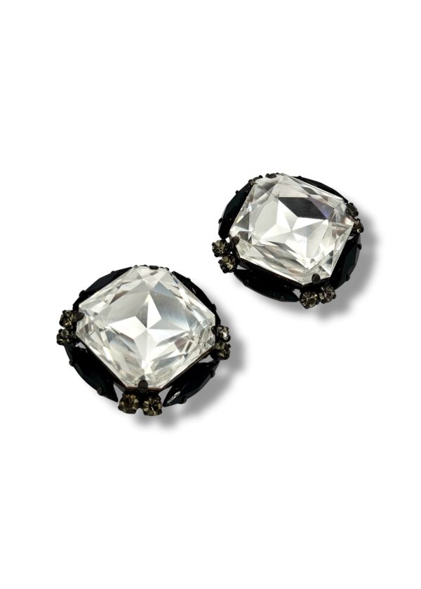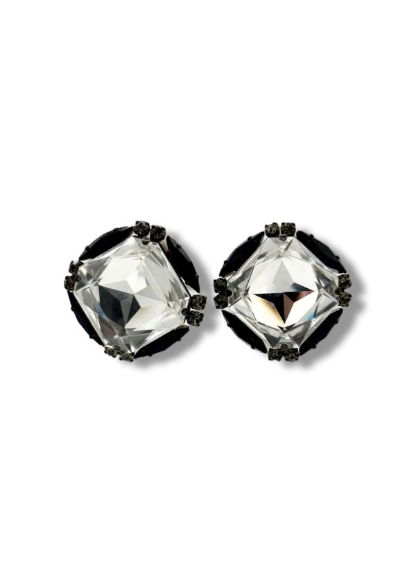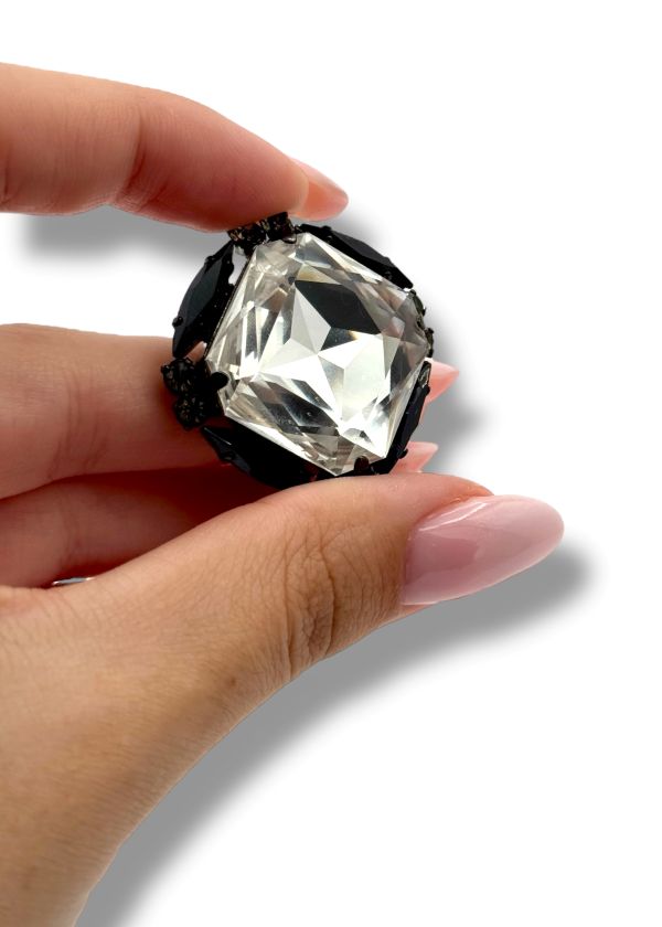 Orecchini a clip made in Italy con maxi cristallo sfaccettato e dettagli scuri. Design audace, artigianato di qualità e stile da vera diva. Pezzo unico e irresistibile. By Ave Caprice.