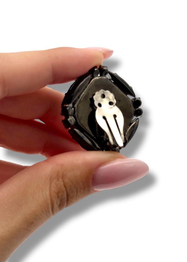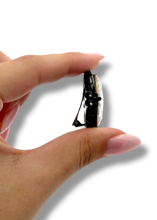La clip, comoda e stabile, consente una portabilità perfetta anche a chi non ha i lobi forati, senza rinunciare all’effetto gioiello. Il metallo brunito lucido, in contrasto con la brillantezza dei cristalli, aggiunge una nota glam senza tempo, rendendo ogni dettaglio volutamente scenografico, ma mai eccessivo. La costruzione artigianale è visibile in ogni finitura e rende ciascun pezzo un’opera unica, diversa da tutte le altre.