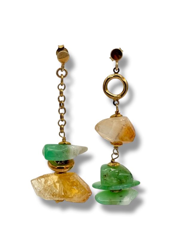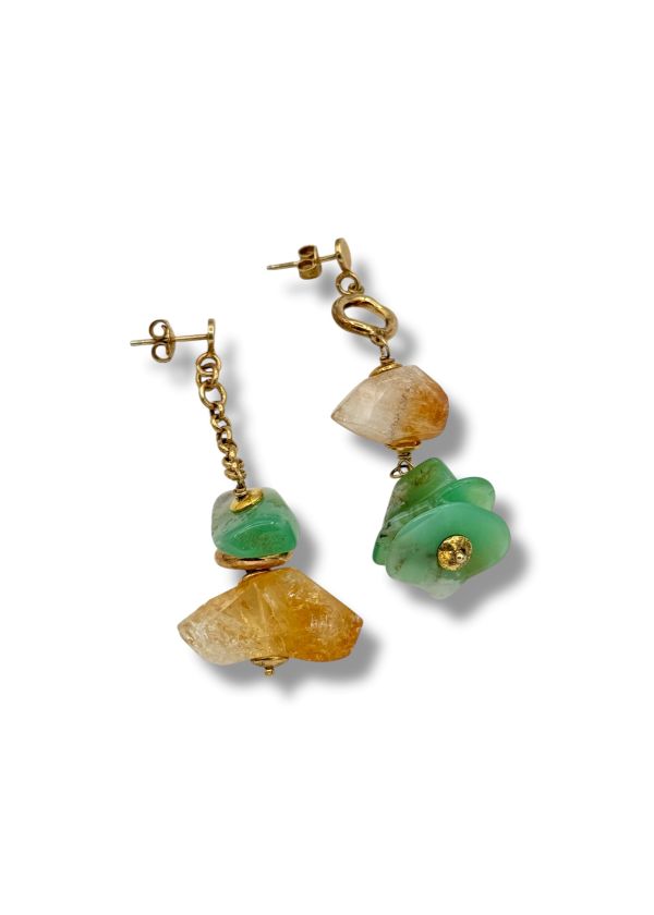 Orecchini in argento dorato con topazio citrino e crisoprasio naturale. Gioiello fatto a mano in Italia, elegante e luminoso. Design artigianale unico e sofisticato. By Ave Caprice.