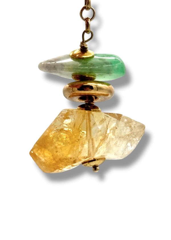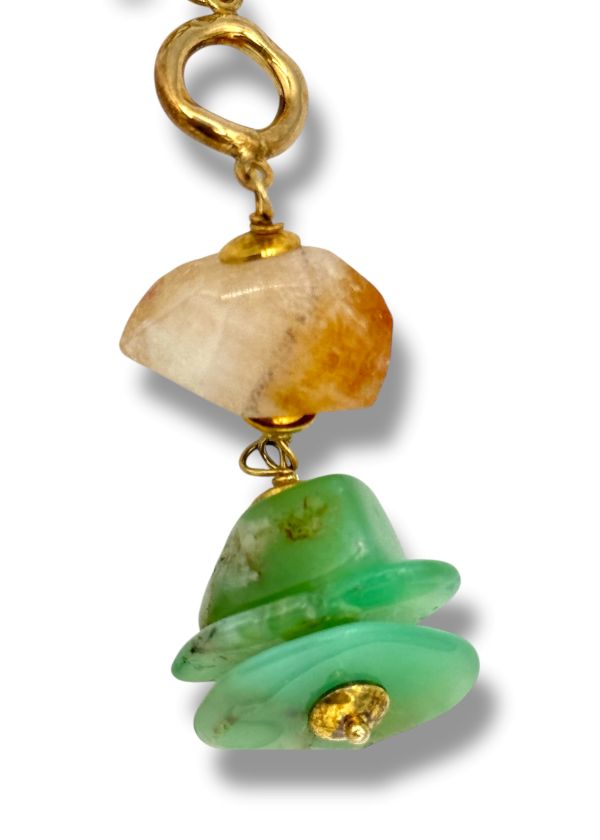 Il topazio giallo, protagonista assoluto di questa creazione, è stato tagliato in modo irregolare per valorizzarne la naturale brillantezza. La sua tonalità giallo miele, limpida e intensa, risulta perfettamente bilanciata grazie alla presenza del verde vivido e fresco del crisoprasio. Quest’ultimo, pietra naturale apprezzata da secoli per la sua energia positiva e per la profondità del suo colore, aggiunge un contrasto cromatico elegante ma deciso.