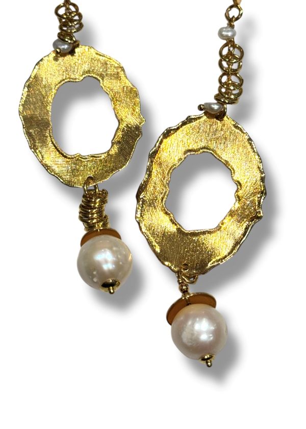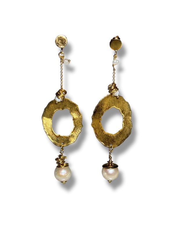 Orecchini pendenti in argento 925 dorato, realizzati interamente a mano con la raffinata tecnica della spazzolatura che dona texture e luce. Il design moderno e giovanile si fonde armoniosamente con l’eleganza intramontabile delle perle coltivate naturali, montate con cura artigianale.