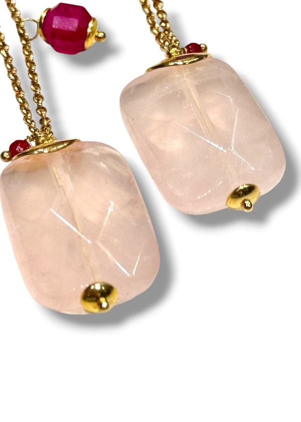 Un gioiello femminile che dona luce al volto. Perfetti per outfit da giorno con una camicia bianca e jeans per un tocco chic, ma anche per la sera con un abito nero o in tonalità pastello per valorizzare il contrasto delicato del quarzo rosa con l’intensità del rubino. Ideali come idea regalo per donna o ragazza che ama distinguersi con accessori raffinati e alla moda.
