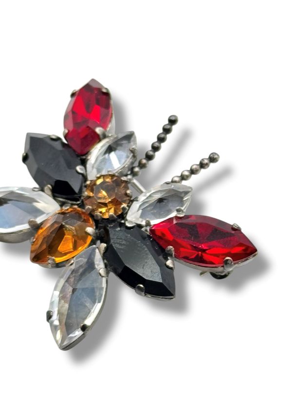 Questa spilla artigianale, realizzata in Italia, racchiude tutta la poesia della natura in un minuscolo capolavoro di luce. La sua silhouette richiama la forma stilizzata di una farfalla in volo, ma lo fa con uno spirito audace e contemporaneo. I cristalli taglio navette e rotondo, dalle tonalità accese e contrastanti, sembrano quasi danzare su una montatura in metallo argentato brunito, che esalta i riflessi e dona profondità al disegno.